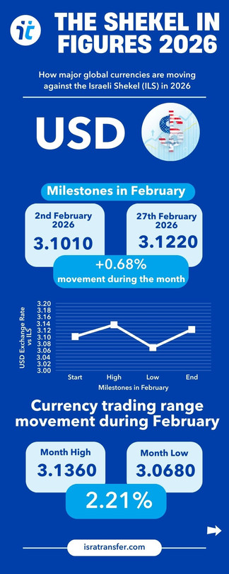 The shekel remained strong throughout February, with USDโILS trading near recent lows before the dollar edged higher toward month-end amid increased geopolitical uncertainty.